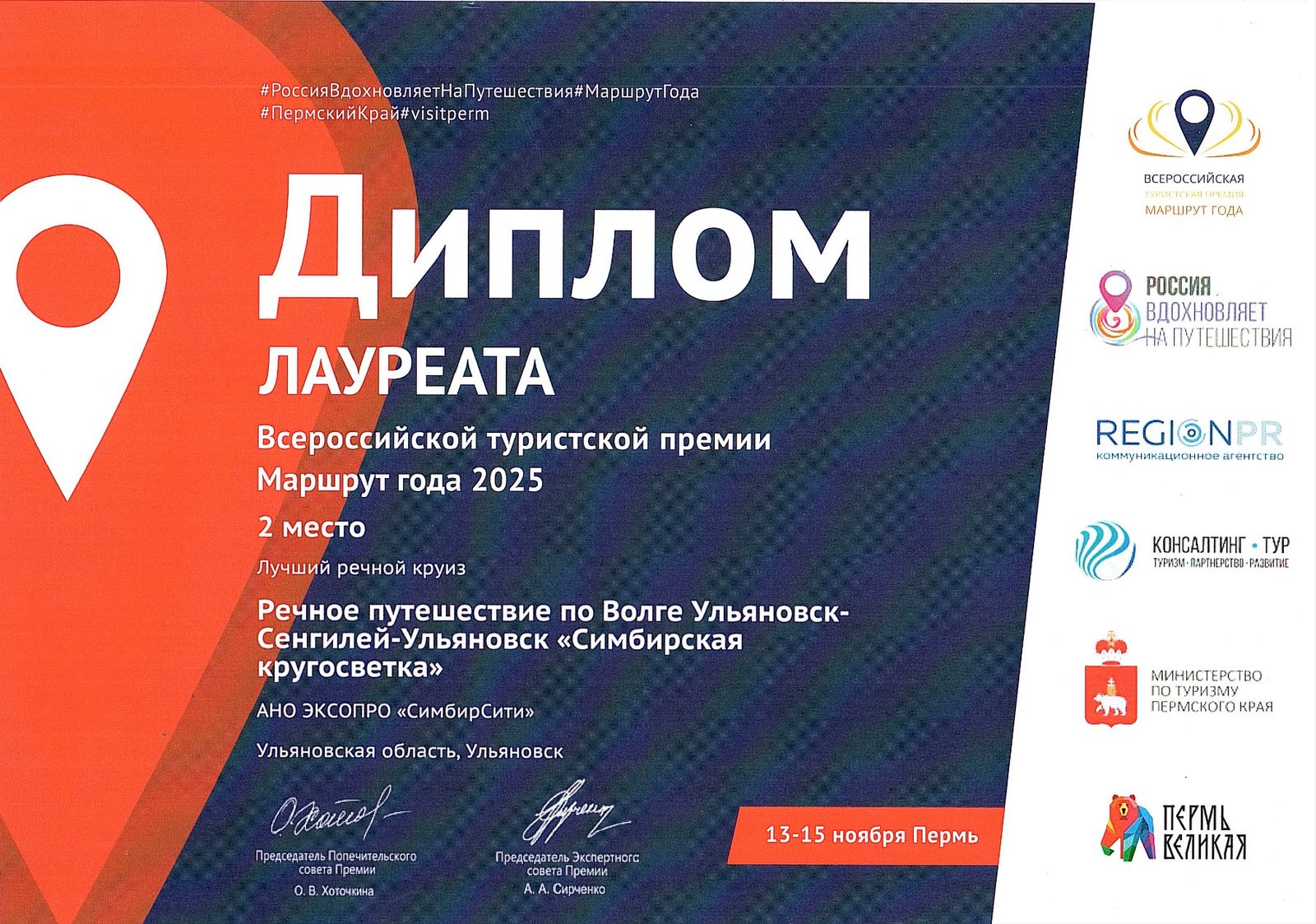Генеральным партнером проекта стал Центр нескучных экскурсий «СимбирСити», которым был представлен новый туристический продукт на Всероссийскую туристскую премию. Проект завоевал 2 место в номинации «Лучший речной круиз».